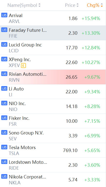 Tesla, Rivian, Lucid, NIO, Xpeng, Li Auto, Arrival, Nikola and Faraday Future rose between 3% and 16%.