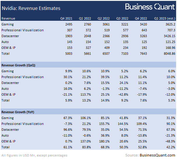 So, while I'm bullish on Nvidia's gaming business over the longer run, I contend that its growth momentum is likely to take a breather in Q1 and in Q2. I expect its gaming revenue growth to slow down to around 6% sequentially, and estimate it to post revenue of $3.62 billion in the said quarter.