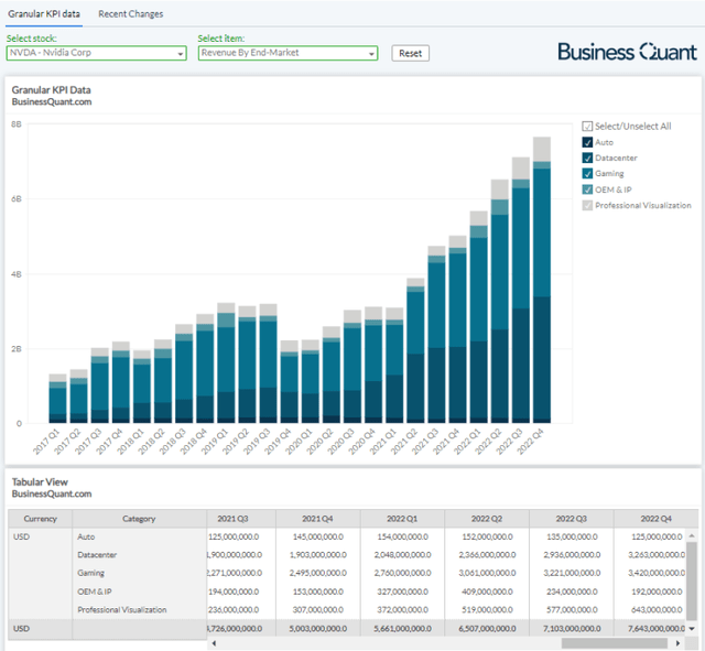 It's worth noting that Nvidia generates its revenue from five end-markets namely, data center, gaming, OEM & IP, automotive and professional visualization. Amongst these, the bulk of its revenue (44.7% in Q4 FY22) comes from its gaming-related SKUs.
