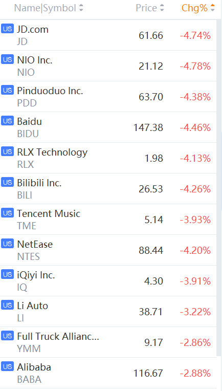 Alibaba, JD.com, Pinduoduo, Baidu, iQiyi, Nio, Bilibili, and NetEase fell between 2% and 5%.