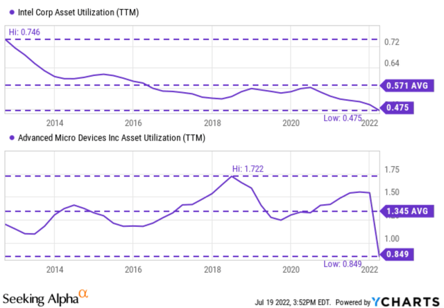 In late June, MU Chief Business Officer Sumit Sadana already mentioned that MU would reduce production. I have not heard about any similar announcement from INTC or AMD yet. But I am seeing similar signs at both places based on their asset turnover rates ("ATR," aka asset utilization) as shown in the chart below. The ATR for INTC has been fluctuating in a range between about 0.746x and 0.475x with an average of 0.571x in the past 10 years. And its current ATR of 0.475x IS the lower end of that range. Also note the sharp decline of the ATR since mid-2020, when its ATR plunged from the historical average level of 0.571x to the current 10-year bottom level.