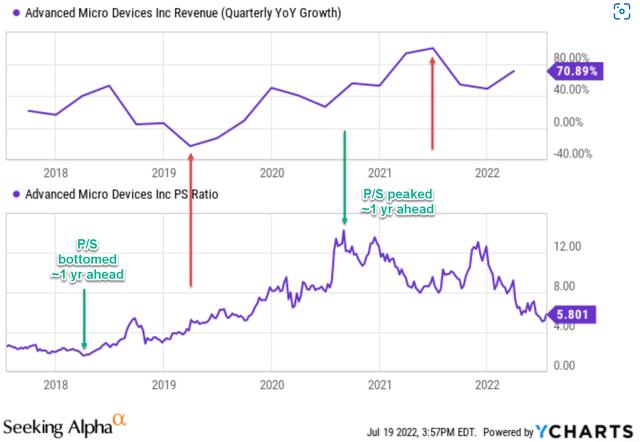 The following chart for AMD illustrates the leading nature of the PE multiple more clearly. The chart shows the YoY quarterly revenue growth of AMD overlaid with its P/S ratio during the last cycle. I am using the P/S ratio here because the earnings for AMD were too volatile in the beginning part of the decade. As you can see, in its last contraction cycle, its P/S bottomed in early 2018, about 1 year ahead of its fundamentals (its contraction did not end till mid-2019). Then in its last expansion cycle, its P/S peaked in late 2020, leading its fundamentals by about 1 year also.