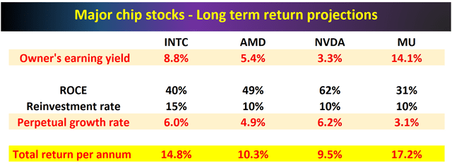 As long-term investors, our approach to return projection is relatively simple. Long-term return is the sum of the owner's earning yield ("OEY") and perpetual growth rates. Details can be found in our earlier article and the results for these four chips stocks are summarized in the table below. As seen, under current conditions, MU provides the highest expected annual return (17.2%), followed by INTC (14.8%), then by AMD (10.3%), and finally NVDA (9.5%). All four are very attractive now. All of them are offering enticing odds for double-digit annual returns in the long term, far exceeding my projection of about 6% for the overall market.