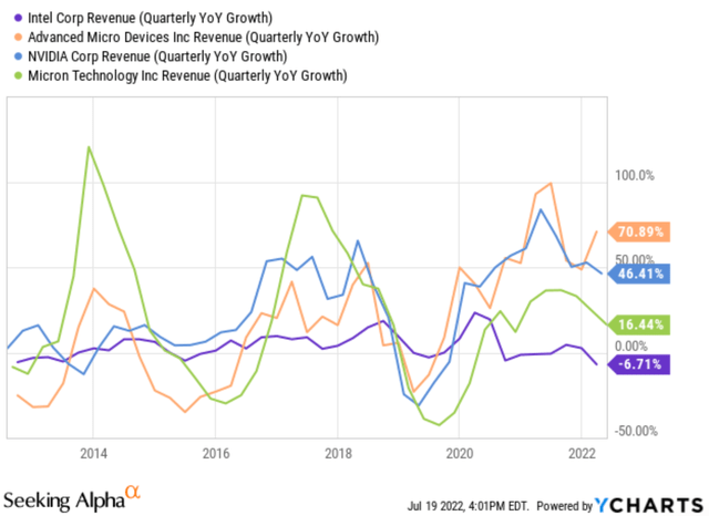 Due to these factors, you can see from the second chart below that MU (the green line) has demonstrated the largest magnitude in its sine wave fluctuation. Peak quarterly growth YoY has been around 100%, and the worst contraction around -50%. In contrast, INTC (the purple line) has demonstrated the smallest magnitude of fluctuation. Both peak growth and contraction have been typically in the teens range.