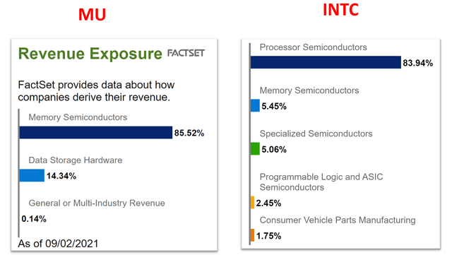 The first one involves the diversification of revenue sources. As you can see from the chart below, MU is among the least diversified in terms of revenue exposure. It derives more than 85.5% of its revenues from memory semiconductors and another 14.3% from data storage hardware (which add up to more than 99% already). And both memory semiconductors and hardware happen to be among the most discretionary items in the semiconductor ecosystem. In contrast, INTC's revenue sources are better diversified and less discretionary. Its largest revenue source is Processor Semiconductors (84% of total revenues), but processors are less discretionary than storage devices and INTC still dominates the CPU market. Then for the remainder of 16%, INTC is also better diversified across Memory Semiconductors, Specialized Semiconductors, programmable semiconductors, and consumer vehicle parts manufacturing. Looking forwards, its foundry initiative will further strengthen its diversification, as argued in ourearlier article.