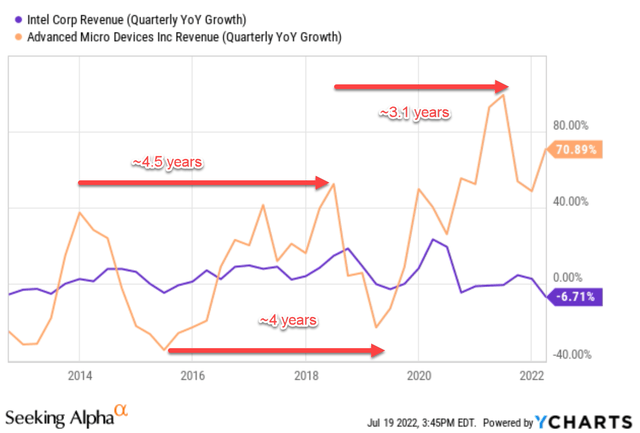 The chart below shows the same information, the quarterly revenues change YoY, for INTC and AMD over the past 10 years. You see the same similar sine wave behavior for both of them. AMD demonstrates the cycles more dramatically and INTC less. INTC is actually the least cyclical one among these four (and we will detail the reasons toward the end). You can clearly see AMD's previous chip expansion cycle peaked in 2014 and peaked again toward mid-2018, resulting in a peak-to-peak duration of about 4.5 years. Similarly, AMD's previous contracting cycle reached its worst in mid-2015 and again in early 2019, resulting in a bottom-to-bottom duration of about 3.1 years. The exact numbers show some variances relative to the average 4-year cycle. But they are close enough, and the broader patterns are identical to those observed for NVDA and MU.