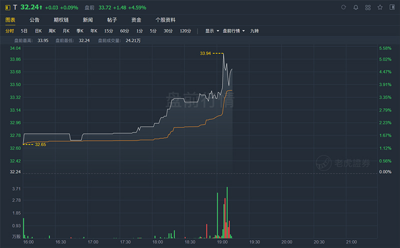 截至发稿,AT&T盘前涨幅扩大至5%。