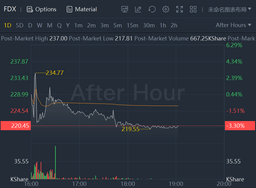 Shares of FedEx fell more than 3% to $220.45 in extended trading.