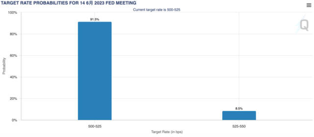 目前,芝商所美联储观察工具显示,6月会议暂停加息的概率为91.5%(非农数据公布前为97.9%),加息25基点的概率为8.5%(非农数据公布前为0%)。