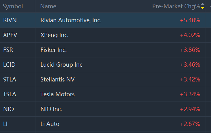Tesla, Rivian, Lucid, Nio, XPeng, and Li Auto rose between 2% and 6%.
