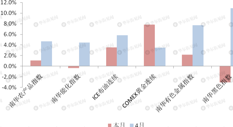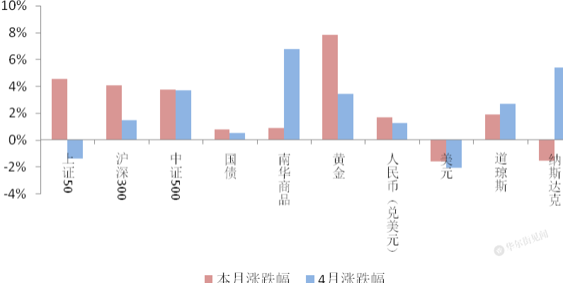 5月国内资产方面并没有比较明显的轮动,除了商品期货因为前期涨幅过高出现回调以外,其他包括股票、债券、黄金、汇率这些资产全都在涨,且表现均好于4月。
