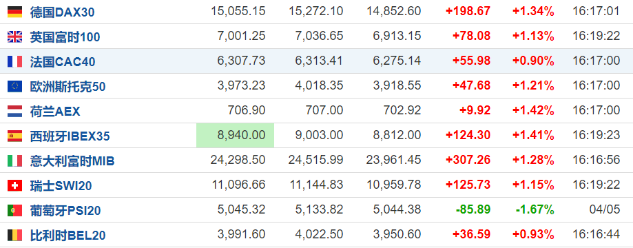欧洲主要指数上涨,欧洲斯托克50指数涨1.21%,英国富时100指数涨1.13%,德国DAX30指数涨1.34%。原油