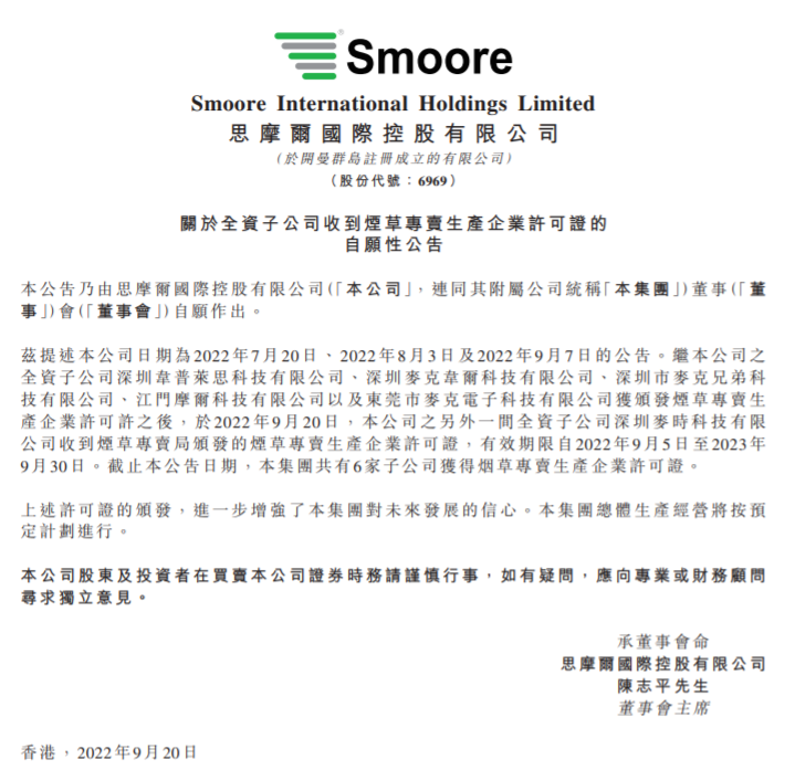 9月20日,思摩尔国际在港交所发布公告,全资子公司深圳麦时科技有限公司今日收到烟草专卖局颁发的烟草专卖生产企业许可证,有效期限自2022年9月5日至2023年9月30日。截止本公告日期,集团共有6家子公司获得烟草专卖生产企业许可证。