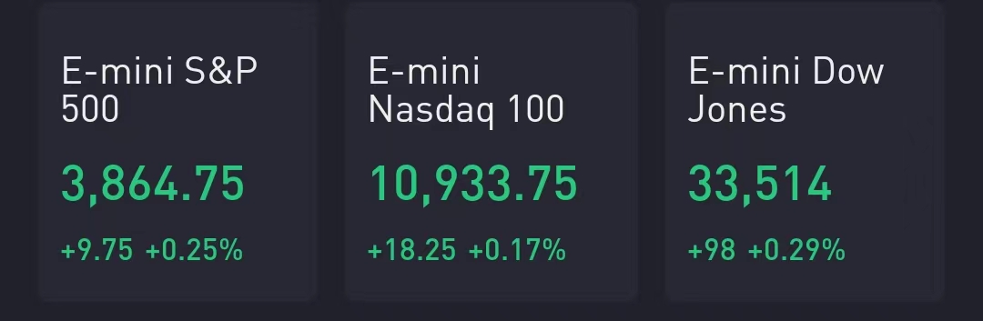 At 7:50 a.m. ET, Dow e-minis were up 98 points, or 0.29%, S&P 500 e-minis were up 9.75 points, or 0.25%, and Nasdaq 100 e-minis were up 18.25 points, or 0.17%.