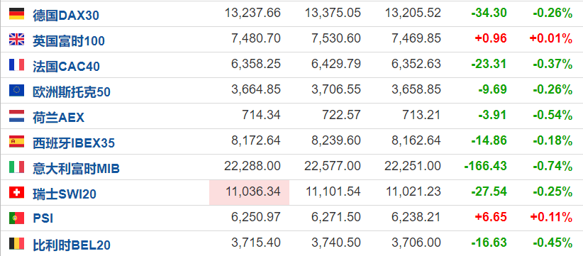 欧洲主要股指跌多涨少,截至发稿,德国DAX30指数跌0.26%,法国CAC40跌0.37%。原油