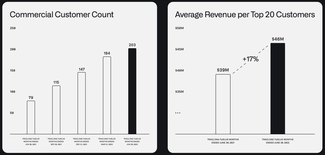 Of course, growth in this space is likely going to be very tricky. You see, in the commercial market, the company ended the second quarter with only 203 customers. That is up significantly from the 79 customers reported one year earlier. This pushed total commercial revenue growth for the company up 46% year over year, climbing from $144 million to $210 million. And average revenue for the trailing 12 months for the top 20 customers combined came out to $46 million. That was up from $39 million experienced only one year earlier. This high dollar amount is rather telling because it indicates just how small the pool of viable prospects are out there who can afford its offerings.