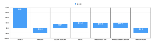 Outside of the revenue picture, investors should also pay attention to profitability. At present, analysts are anticipating a loss per share of $0.05. On an adjusted basis, this would translate to a profit per share of $0.02. to put this in perspective, during the third quarter of last year, the company lost $0.05 per share, totaling $102.1 million in all. But on an adjusted basis, the company generated a profit of $82.1 million. Obviously, investors should also be paying attention to other profitability metrics. For context, in the third quarter of last year, the company generated operating cash flow of $100.8 million. On an adjusted basis, this number was $104.5 million. And finally, EBITDA for that time totaled $119.2 million.