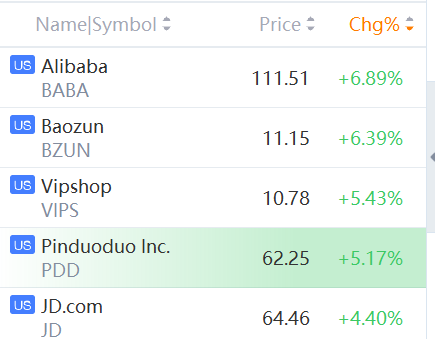 Alibaba, JD.com, Vipshop, Baozun, and Pinduoduo rose between 4% and 7%.