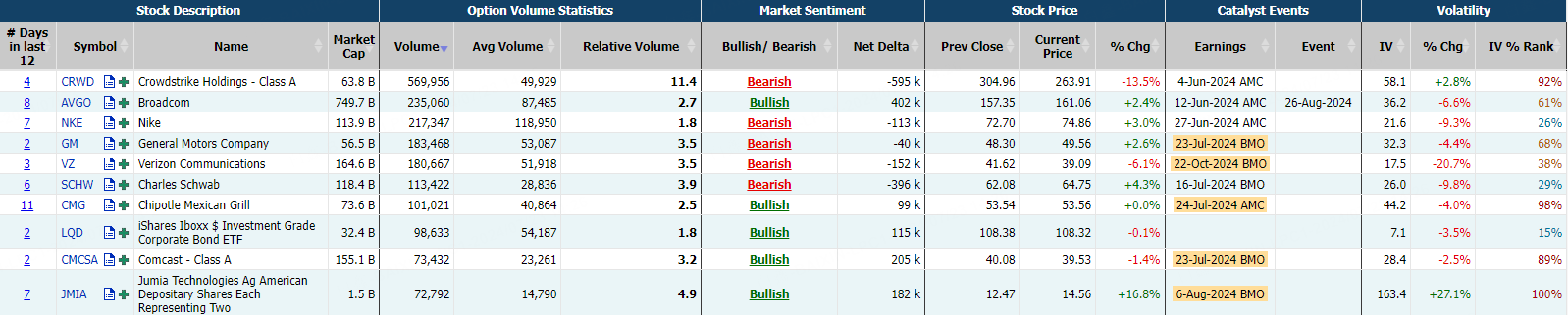 This report shows stocks with the highest volume of bullish and bearish activity by option delta volume, which converts option volume to an equivalent stock volume (bought or sold).