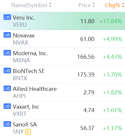 Novavax, Moderna, BioNTech, Sanofi, Vaxart, and AHPI rose between 1% and 5%.
