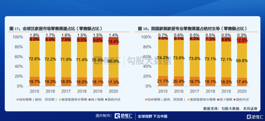 这意味着,家具消费低频、高价,重场景体现,这些特征决定了线下渠道的不可替代性,并且渠道价值先于品牌价值。无论国内还是国外,泛家居市场零售中,线下的专业零售店占比都是最重。