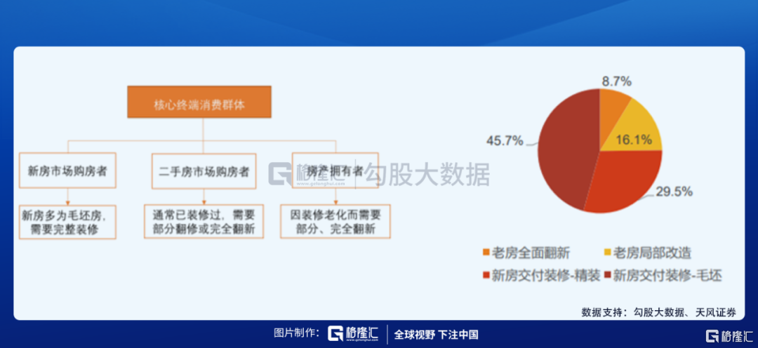 第二个是老房翻新需求,二手房购买者和房产拥有者,因装修老化,装修风格陈旧,局部翻新与全面翻新的需求旺盛,国内一二级城市老房和二手房翻新和改善型消费需求在装修中总量占比达到了54.3%,已经超过了新房。