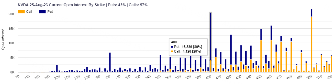 Traders are betting on a swing in the stock of about 11%—up or down—through the end of the week, options pricing shows. And that is well above the average move of about 7% seen after the last eight earnings releases. The robust activity suggests some traders are fearful of missing out on further gains in Nvidia, while others are likely eager to take advantage of the big one-day moves in its shares. Nvidia’s $400 strike put options expiring August 25 also worth attention with a total number of 16,386 open interest as of Tuesday.