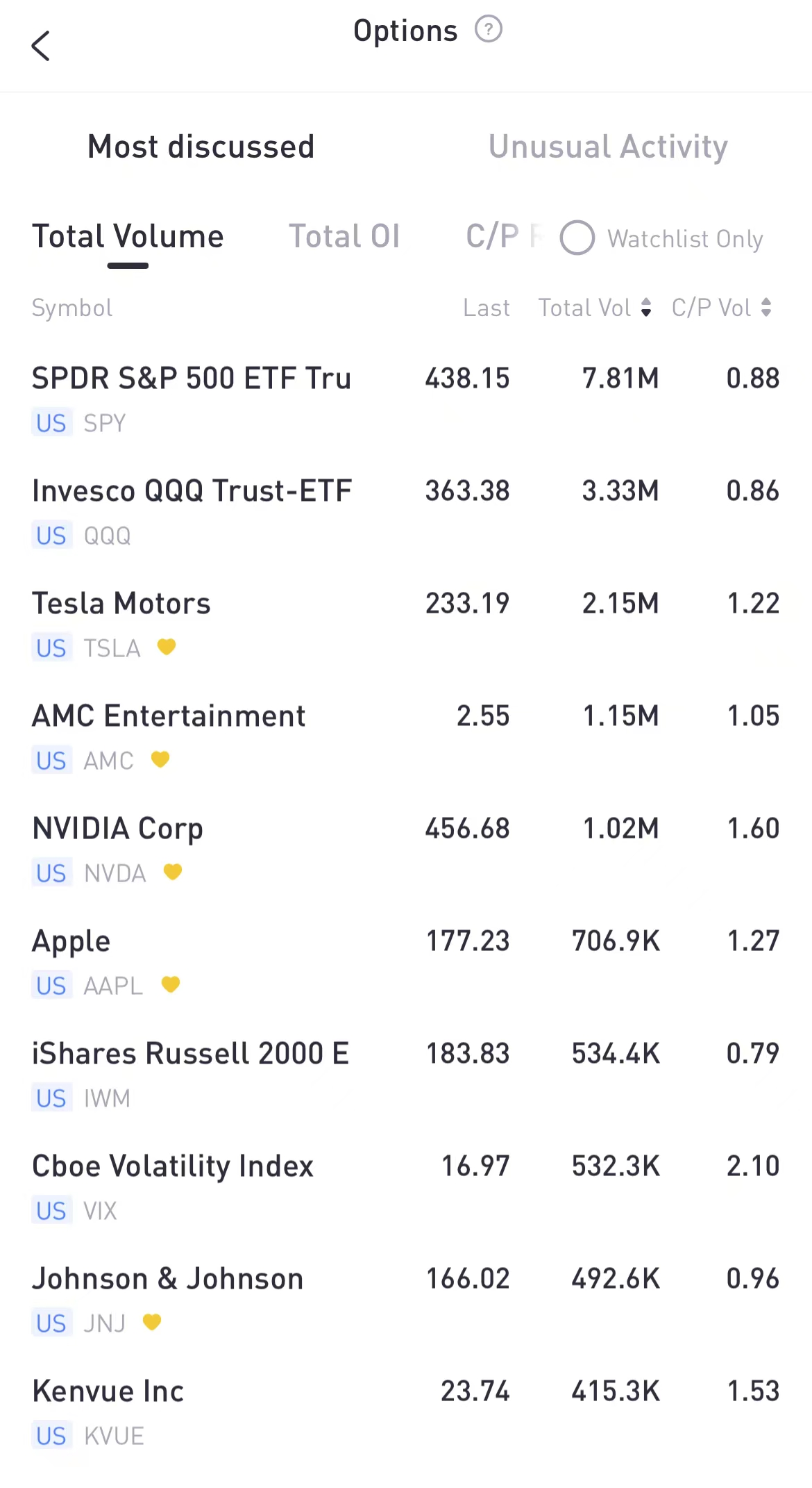 Top 10: SPY; QQQ; TSLA; AMC; NVDA; AAPL; IWM; VIX; JNJ; KVUE