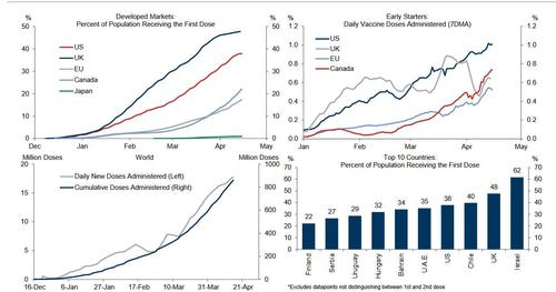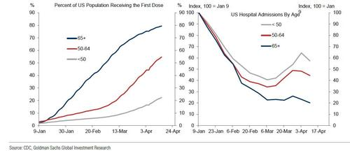 A year ago, Goldman Sachs wrote about an adage that came to characterize the market’s response to the pandemic: "investors can not afford to wait for the resolution to a problem that they know will be resolved."And a year later, around the timeWall Street decided that covid is now behind us, the resolution is well and truly underway in the US with 38% of Americans having already received a first shot of the vaccine.