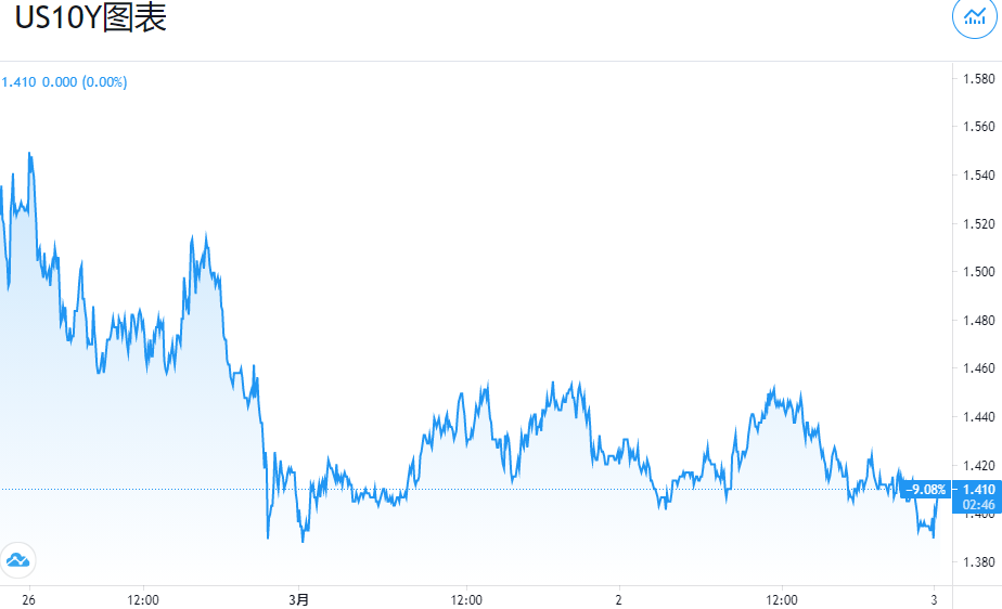 10年期美债收益率上周曾跃升至1.614%,本周二下跌2.6个基点报1.396%