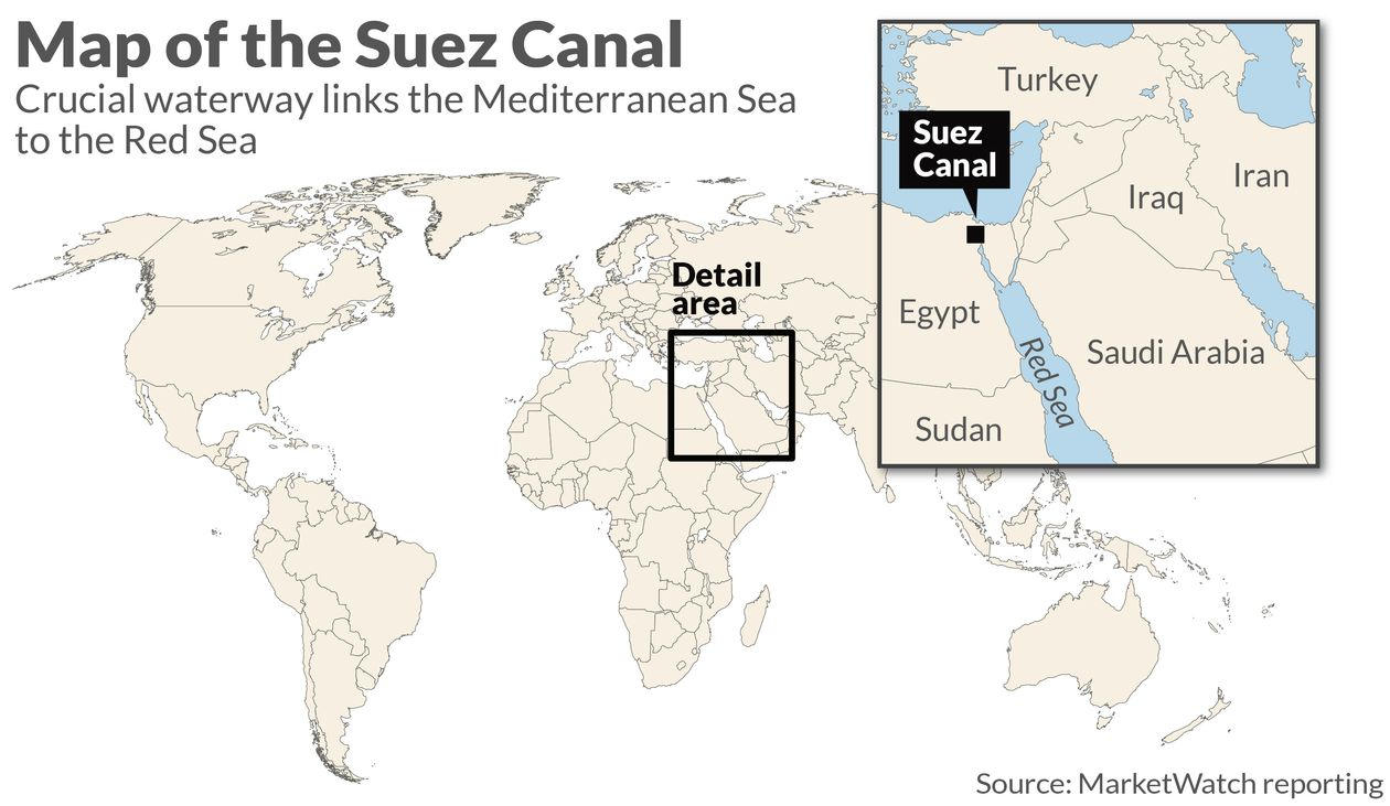 The MV Ever Given, a Panama-flagged ship with an owner listed in Japan, turned sideways in the canal on Tuesday, blocking traffic in the waterway, which divides continental Africa from the Sinai Peninsula. An estimated 10% of total seaborne oil trade passes through the Suez Canal, which connects the Red Sea with the Mediterranean Sea.
