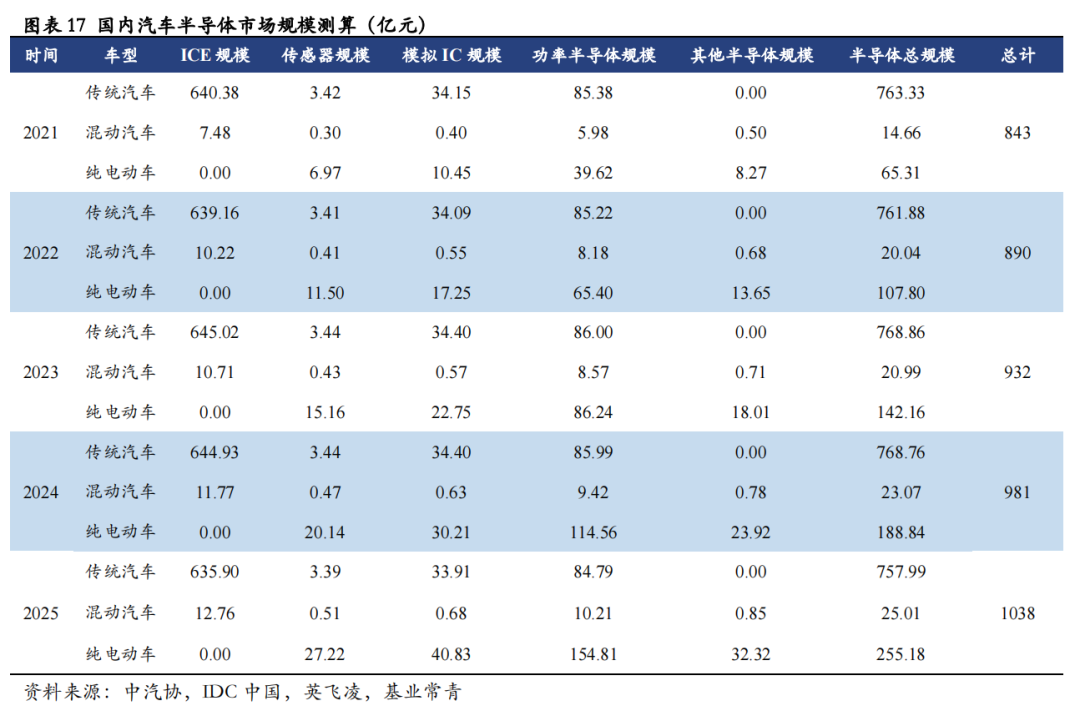 国内汽车半导体稳步发展,2025年市场规模达1038亿元,但传统汽车用半导体仍占汽车半导体市场的70%以上。预计至2025年,传统汽车半导体市场总规模为758亿元,市场规模仍然较大,其中,传统汽车半导体市场中占比最高的为ICE半导体,主要用于动力控制,占比为83%;混合动力汽车半导体市场仅为25亿元,整体市场规模较小,年复合增速为14%;纯电动车半导体市场将达255亿元,年复合增速达41%。对于整个汽车半导体市场来说,规模有望从2021年的843亿元增长至2025年的1038亿元。