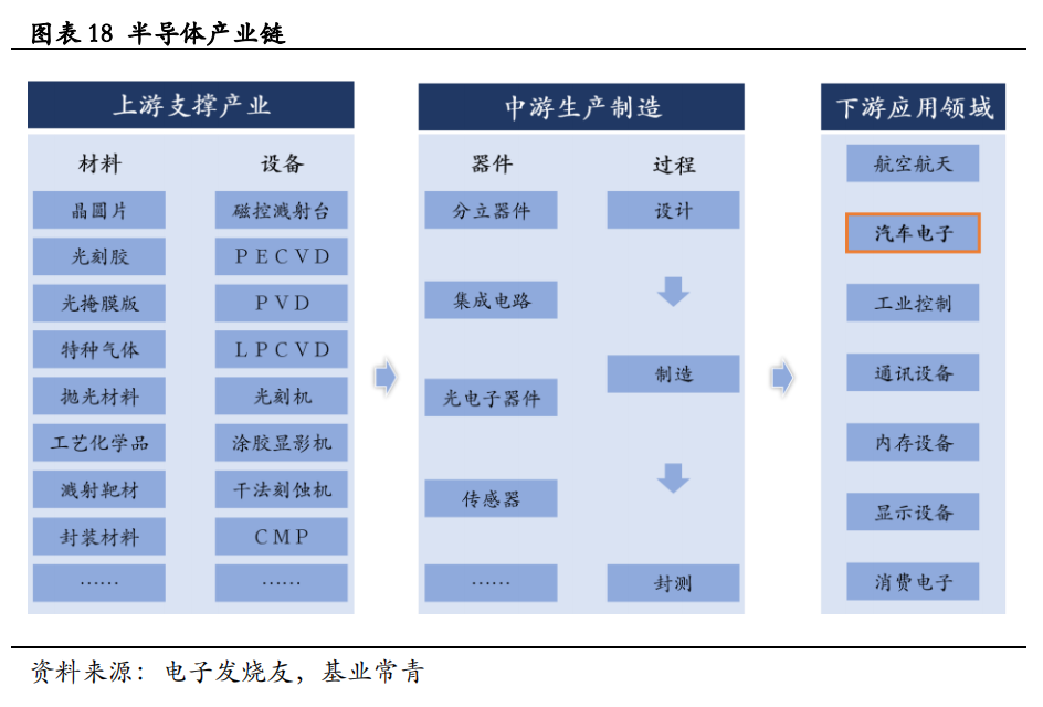 半导体产业主要包括上游支撑产业、中游生产制造和下游应用领域三大部分。上游支撑产业涉及材料及设备两个方面;中游生产制造涉及分立器件、集成电路、光电子器件、传感器等器件,并通过设计、制造和封测等工艺实现;下游为社会生产生活的应用领域,包括航空航天、汽车电子、工业控制、通讯设备、消费电子等领域。本文主要介绍半导体在汽车领域的应用。