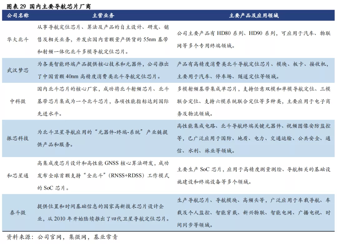 国内导航芯片产业链逐步完善,相关厂商不断切入,应用领域快速拓展。目前国内主要导航芯片厂商基于传统导航芯片领域不断延展,逐渐发展出多模定位、模块、智能算法、高精度等各类相关产品,并开始进入运动健康、安防监测、广播电视等诸多相关领域,相关厂商数量也不断增加。随着北斗导航系统的不断完善,国内导航芯片行业快速发展。