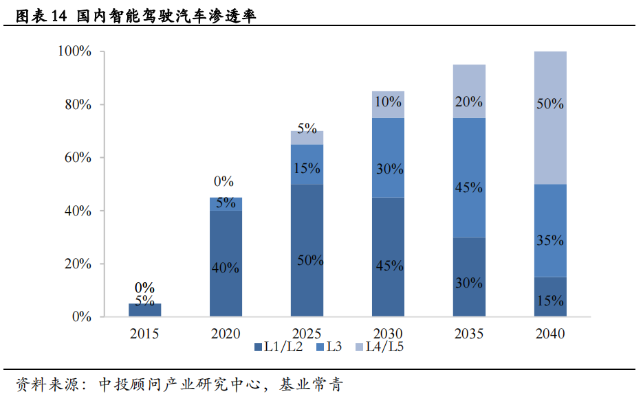 半导体的增量成本随自动驾驶级别的提升而增大,智能汽车渗透率的提升将大幅增加半导体需求。英飞凌数据显示,L4/L5级别自动驾驶汽车的半导体增加的总成本为860美元/辆,L3级别为580美元/辆,L2级别为150美元/辆;L2升级到L3级别半导体成本的涨幅为286.7%,L3升级到L4/L5级别半导体成本涨幅达48.3%。2020年国内智能汽车的渗透率为45%,预计2025年渗透率将达70%,2040年国内智能驾驶渗透率将达100%。由此可见,汽车半导体的未来需求增量空间大。