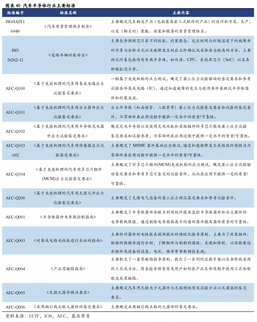汽车半导体除了汽车行业通用的规范外,还有更严苛的车规级认证标准。AEC-Q系列标准是针对汽车半导体的车规级认证标准,对汽车半导体提出了更严苛的要求,如车载芯片对故障率要求是百万分之一,大部分车厂对车用芯片故障率要求甚至达到十亿分之一,而消费级芯片对故障率的要求只有千分之一。除此之外,汽车半导体对温度、湿度、发霉、粉尘、盐碱环境、EMC及有害气体侵蚀等方面都有严格的要求。