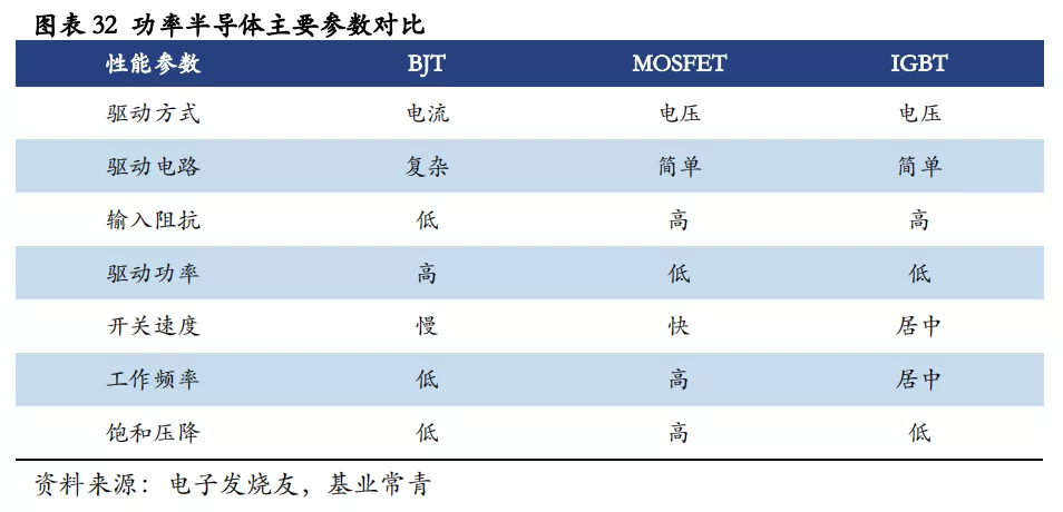 MOSFET和IGBT是两种最重要的功率分立器件。与BJT相比,MOSFET和IGBT均为电压驱动型,且具有驱动电路简单、输入阻抗高、驱动功率小等优势。与此同时,MOSFET的开关频率高且电流大,但耐压程度要略逊一筹,故主要用于高频电源领域;IGBT的开关频率相对适中,但可以承受大电流及电压,主要应用于逆变器、变频器、感应加热等领域。