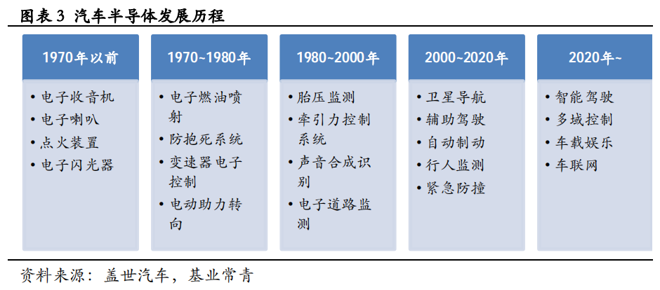汽车半导体的每个发展阶段都伴随着革命性产品的应用,至今已经历五个发展阶段:前四个阶段分别为1970年以前、1970~1980年、1980~2000年、2000~2020年,每个阶段的代表性装车产品成为时代的标志;第五个阶段从2020年开始,随着新能源汽车续航里程、充电速度等技术瓶颈逐步突破,自动驾驶、车联网稳步发展,车载娱乐及辅助驾驶系统性能快速提升,汽车半导体需求持续提升,汽车半导体产业将迎来黄金发展时期。