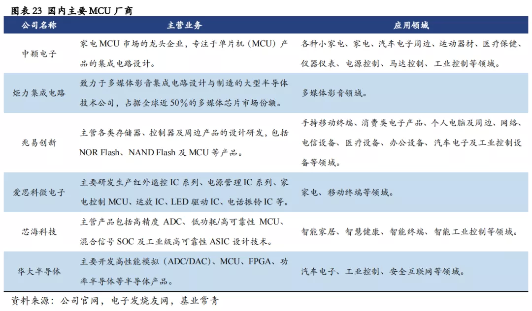 国外厂商占据汽车等高端MCU市场,且多为综合服务提供商;国内MCU厂商处于起步阶段,主要应用领域为消费电子等中低端市场。国外MCU厂商业务规模较大,MCU产品类别较为全面,且具有提供完整的控制系统解决方案的能力,是汽车MCU的综合服务提供商。国内MCU厂商的大部分产品主要应用于家电、多媒体等消费电子领域和工业控制领域,用于汽车领域的MCU成熟产品较少,且产品类别仍不够全面,高端MCU产品量产较少。