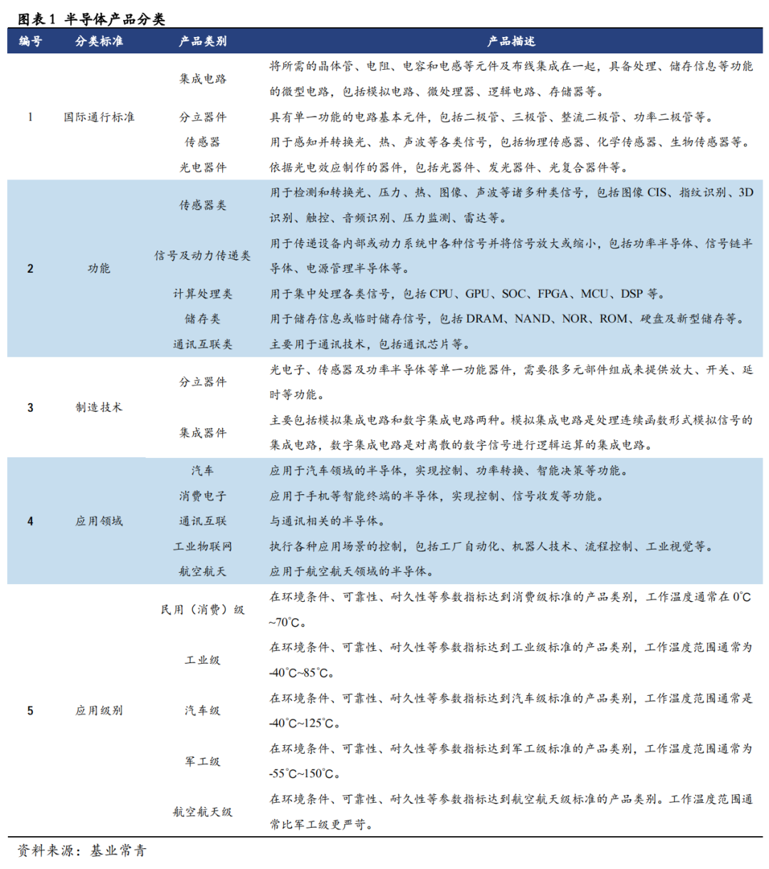 半导体是指常温下导电性能介于导体与绝缘体之间的材料,广泛运用于消费电子、通讯互联、智能制造、新能源汽车、发电照明等各个领域,是关键的电子器件。根据国际惯例、功能、制造技术、应用领域、应用级别等标准,可将半导体分为不同的类别,每种类别均包含众多细分产品。