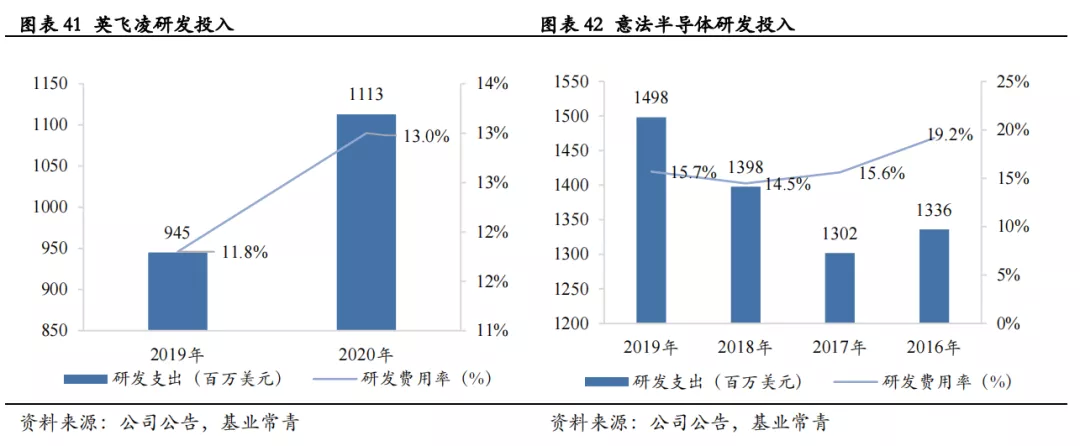 汽车半导体的高要求需要持续的资金投入,以实现技术的突破和创新,保持市场竞争力。汽车半导体产品在设计、制造、封测等各个环节均有较高的技术壁垒,近年来国际主要汽车半导体厂商均通过大量研发投入来提升技术水平,以保持市场竞争优势。英飞凌2020年研发投入高达11.13亿美元,比2019年提高了18%;意法半导体2019年研发投入高达14.98亿美元,研发费用率达到15.7%。可以看出,持续不断的研发投入是国内厂商追赶国际巨头的必由之路,也是国内厂商发展过程中存在的一大难题。