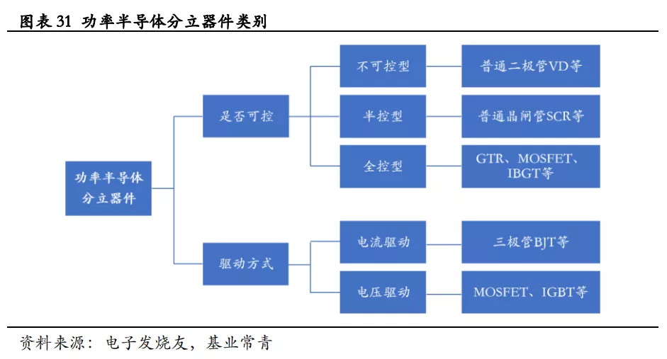 (3)功率半导体——主要用于电力设备的电能变换和控制电路等方面,如IGBT、MOSFET、GTR等;