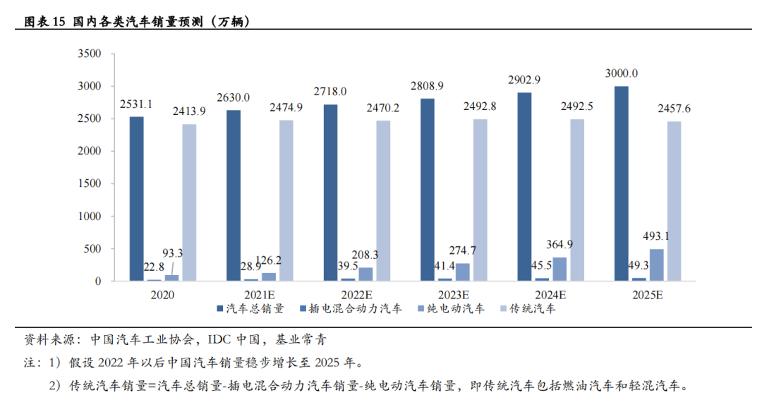 新能源汽车销量快速增长,传统汽车将在2023年迎来销量拐点。根据中汽协数据,预计2021年到2025年,中国汽车总销量将从2630万辆增长至3000万辆;纯电动汽车销量将从126.2万辆上升到493.1万辆,年复合增长率为40.6%;传统汽车(包括燃油汽车和轻混汽车)销量将从2474.9万降至2457.6万辆,且在2023年正式迎来销量拐点。