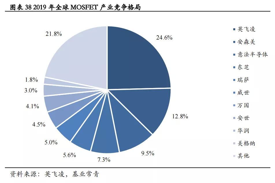 国外头部厂商占据全球MOSFET市场81.2%的份额,国内厂商安世半导体、华润微位居第八、九位。2019年全球MOSFET市场占有率前三位的厂商分别是英飞凌(24.6%)、安森美(12.8%)、意法半导体(9.5%),CR3达46.9%;国内厂商安世半导体排名第八(占4.1%市场份额),华润微市占率进入前十(占3.0%市场份额)。因此,在全球MOSFET市场的竞争中,国内厂商仍处于追赶的状态。