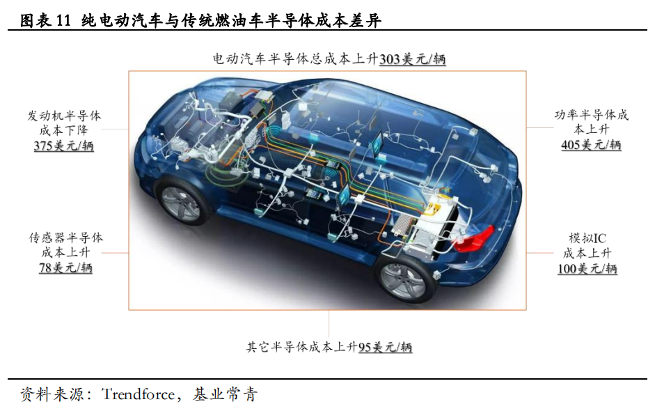 相对于传统燃油车,纯电动车的半导体成本显著增加。Trendforce数据显示,纯电动车的功率半导体成本上升405美元/辆、传感器半导体成本增加78美元/辆、模拟IC成本上升100美元/辆、其它类半导体成本上升95美元/辆,但与发动机相关的半导体成本降低375美元/辆。总体来看,每辆纯电动车的半导体总成本上升303美元,纯电动车半导体成本为传统燃油汽车的1.67倍。