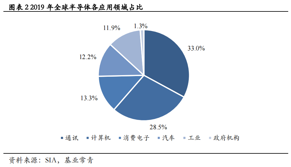 汽车是半导体的重要应用领域,车规级半导体具有技术壁垒高与需求旺盛的特点。汽车级半导体的性能要求高于工业级和消费级半导体,同时,需求量高于军工级和航空航天级半导体,因此,汽车级半导体兼具高技术壁垒和高需求的特点。2019年,全球汽车半导体的用量占半导体总量的12.2%,是仅次于通信、计算机、消费电子之后的第四大应用领域。
