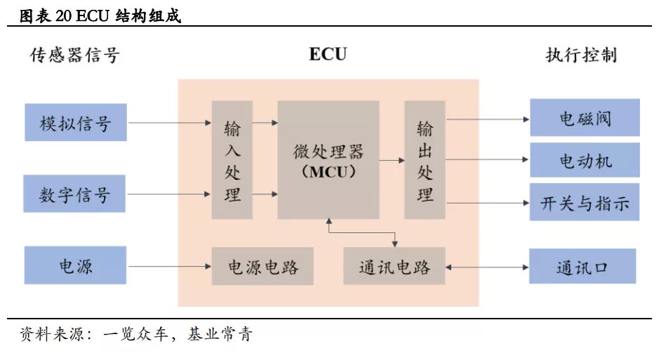 MCU是汽车电子控制单元(ECU)的重要组成部分。ECU又称为汽车的“行车电脑”,主要通过车载传感器信息、总线数据的采集和交互来判断车辆状态,并结合驾驶员的意图,借助执行系统来操控汽车。常见的ECU有发动机管理系统(EMS)、自动变速箱控制单元(TCU)、车身控制模块(BCU)、车身电子稳定控制系统(ESP)、电池管理系统(BMS)、整车控制器(VCU)等。通常情况下,ECU包括输入处理电路、MCU、输出处理电路、通讯电路、电源电路等组成部分,其中,MCU是ECU的核心。