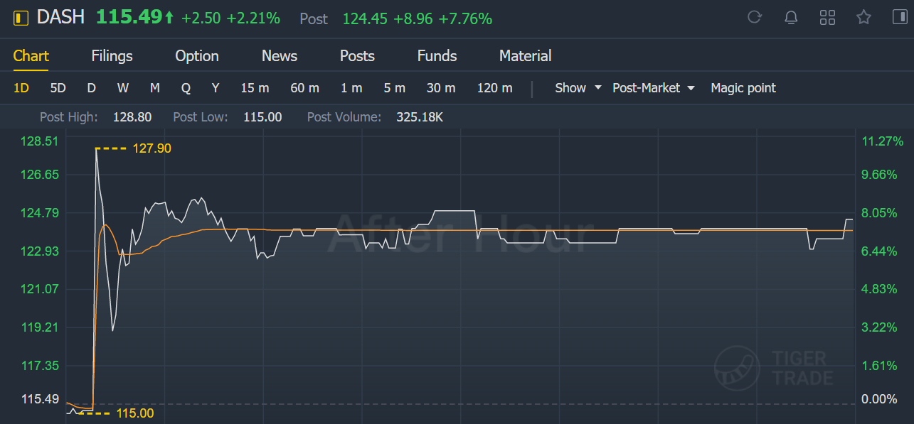 DoorDash shares rose sharply after hours, climbing nearly 8% after hitting a new intraday low but closing the regular session 2.2% higher at $115.49.