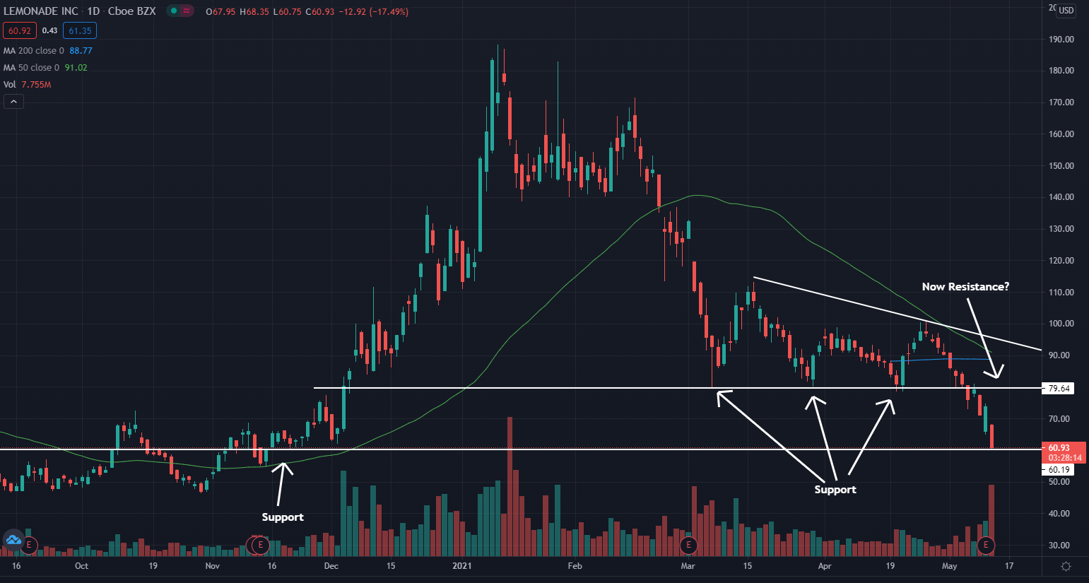 - Lemonade shares recently broke out of what technical traders may call a descending triangle pattern and are now looking to find support at a previous area of support.