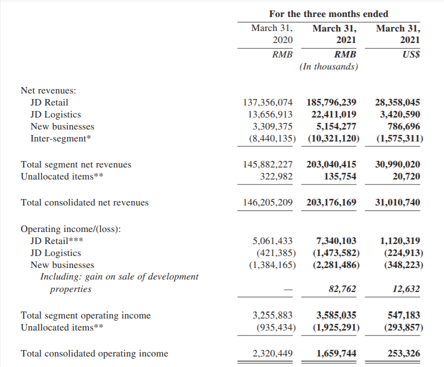 - Income from operations for the first quarter of 2021 was RMB1.7 billion(US$0.3 billion), compared toRMB2.3 billionfor the same period last year.Non-GAAP2income from operations for the first quarter of 2021 wasRMB3.5 billion(US$0.5 billion), compared toRMB3.3 billionfor the first quarter of 2020. Operating margin of JD Retail before unallocated items for the first quarter of 2021 was 4.0%, compared to 3.7%3for the first quarter of 2020.